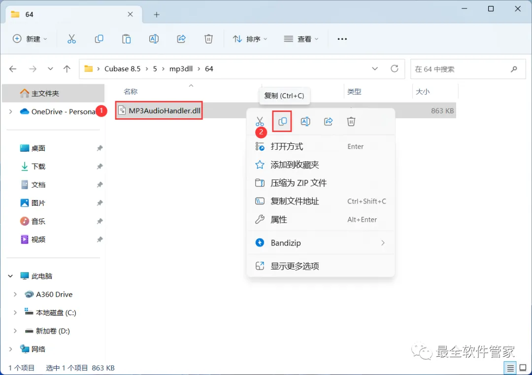 34、找到【MP3AudioHandler.dll】文件,再右键点击【复制按钮】