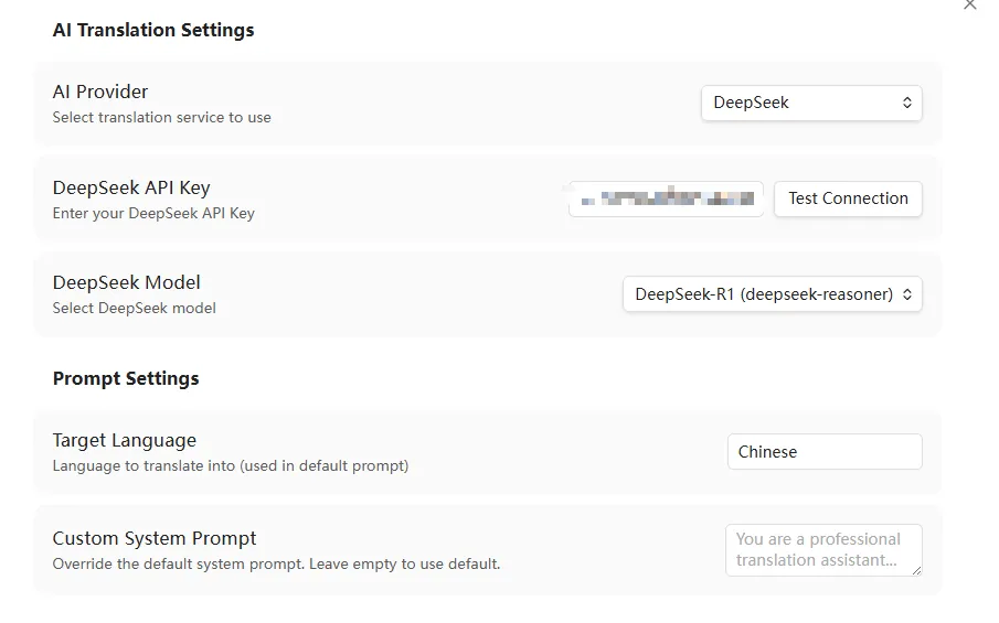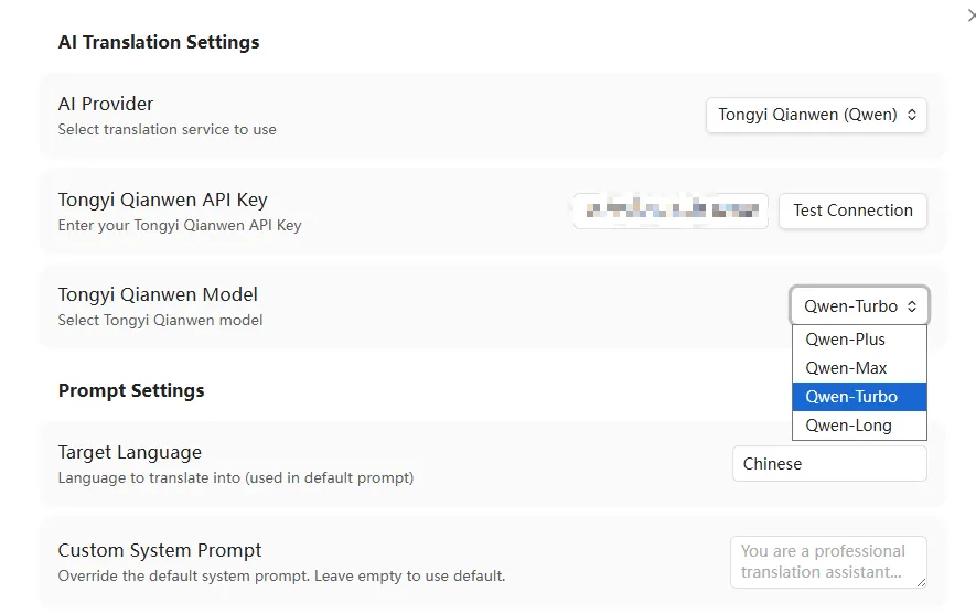 插件会优先使用您的自定义提示词,这将使翻译结果更符合您的个性化需求。