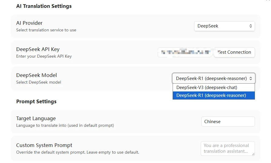 高度可定制化:支持自定义翻译提示词(System Prompt)、目标语言等,满足学术、技术等不同场景的翻译风格要求。