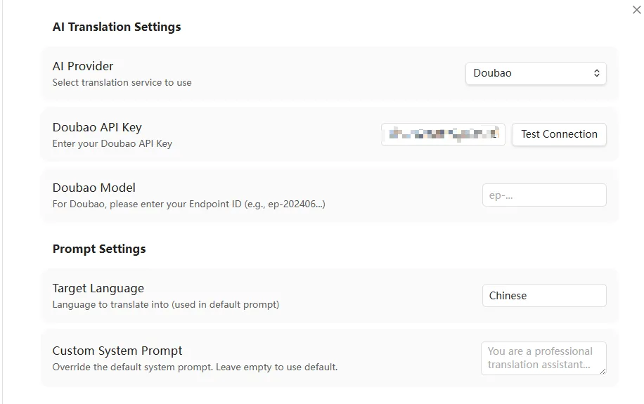 启用插件后,进入 设置 -> AI Translator 界面,根据您选择的服务商进行配置。