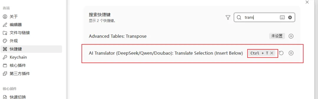 考虑到工作场景下需要频繁查阅英文文献与记录笔记,为提升阅读效率,期望在 Obsidian 软件中实现以下功能: 选中文本后,通过快捷键即可调用高质量翻译,并直接插入笔记。