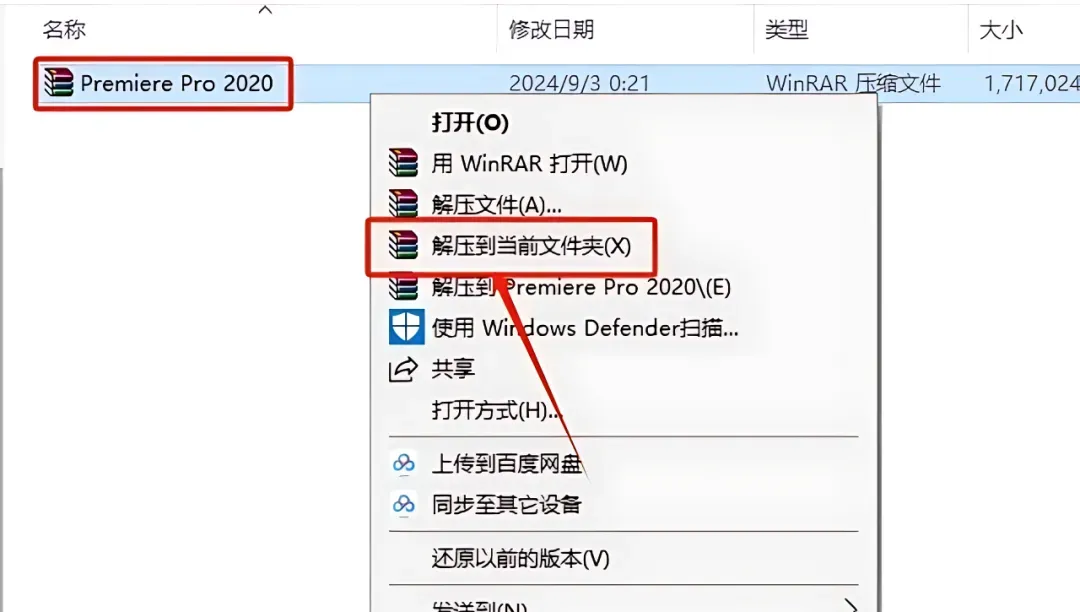 1.打开下载好的Pr软件安装包,鼠标右击压缩包选择【解压到当前文件夹】。