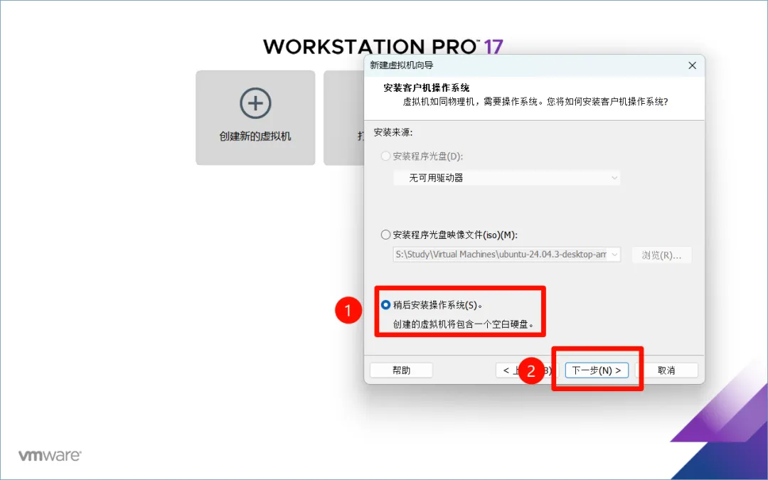 在安装源选项中,选择 “稍后安装操作系统”(便于手动调整硬件配置,避免简易安装带来的权限或路径问题)。
