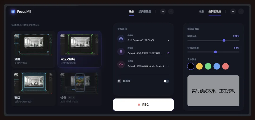 2. 录制模式选择区,有4张卡片(全屏、自定义区域、窗口、移动端设备),点击其中一个卡片,进入到录制设置工具栏。 -
