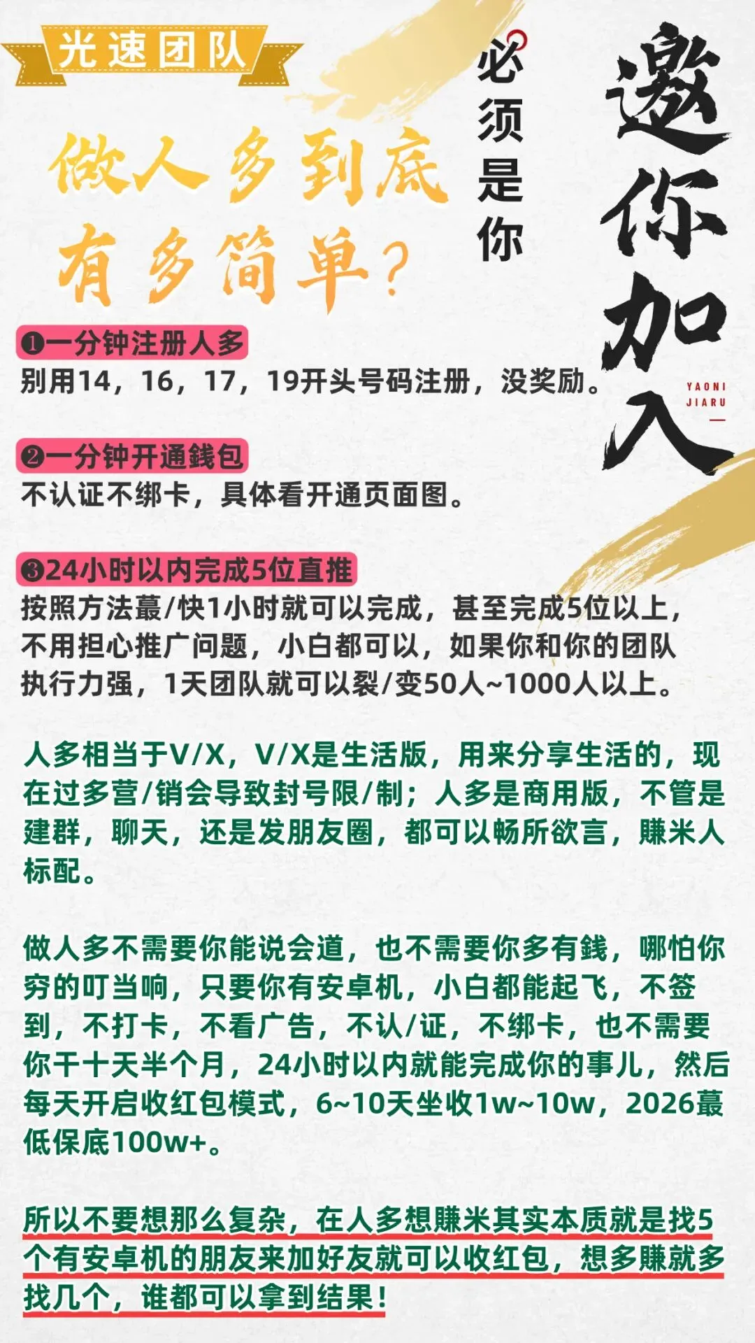 新用户注册即获赠余额,普通会员通过推/荐使用可实现十代裂/变,不断扩展人脉资源并获得持续性红包收/益,形成强/大的流/量自循环体系。分享即获利,分享越多,收/益越高。