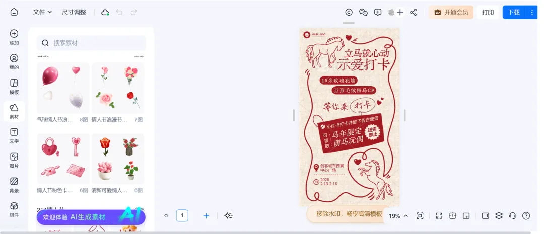提供多种情人节主题元素,画布界面直接搜索调用,图片内容更丰富