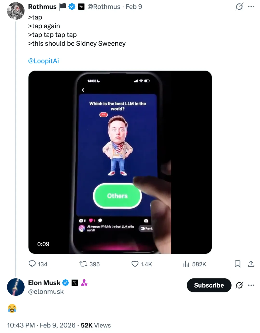 乍一看,还以为是 AI 生成的恶搞短片。但当手指戳了一下屏幕不选择“其他模型”时——Grok 越变越小,其他模型越变越大,只有当你选择 Grok 时,马斯克才会舞动起来