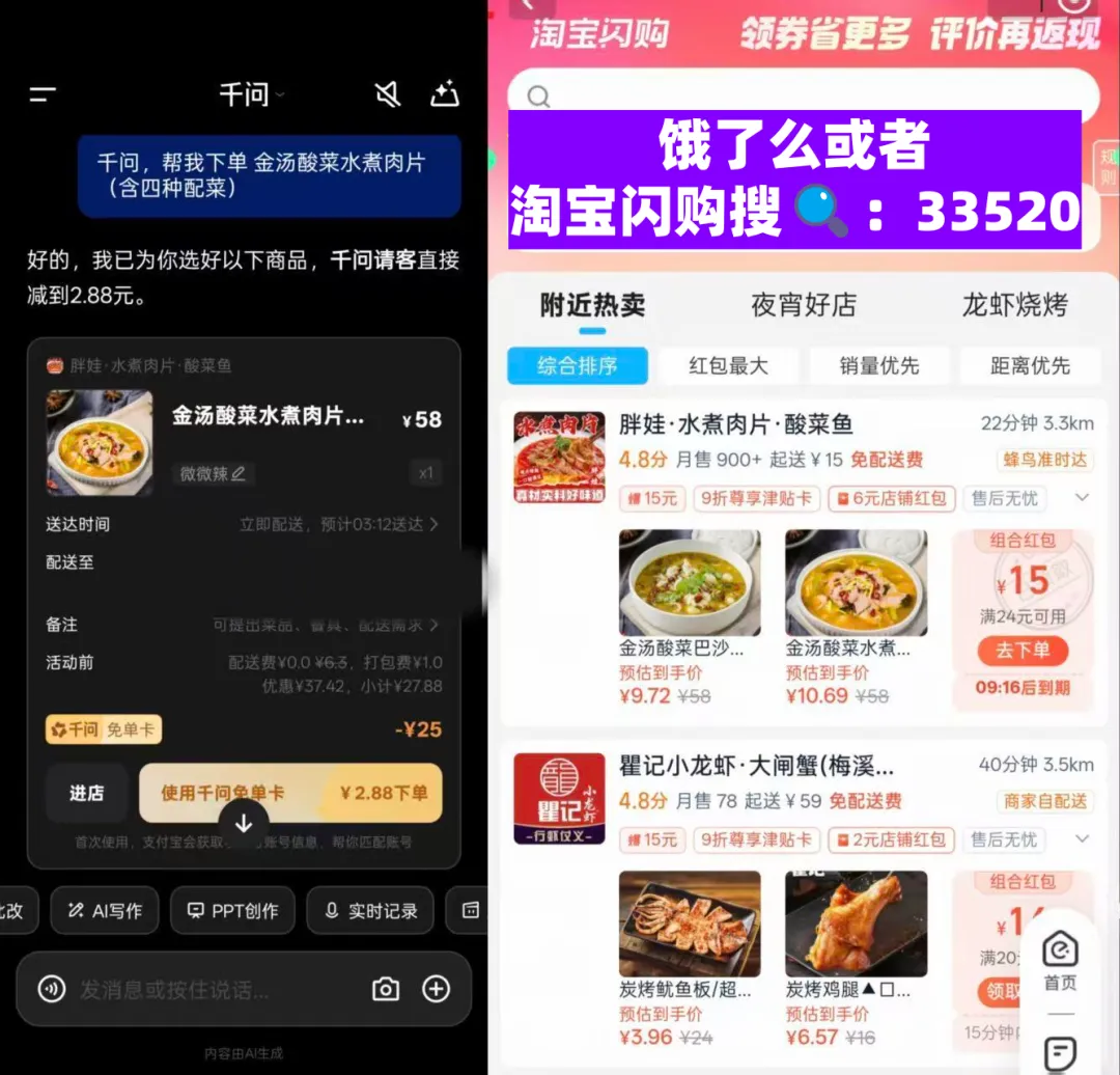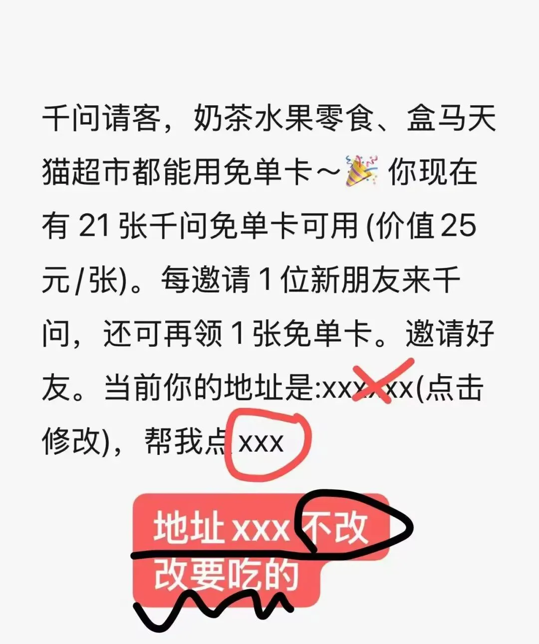 千问请客,奶茶水果零食、盒马天猫超市都能用免单卡~🎉 你现在有 21 张千问免单卡可用(价值25元/张)。每邀请 1 位新朋友来千问,还可再领 1 张免单卡。邀请好友。当前你的地址是:xxxxxx(点击修改),帮我点xxx