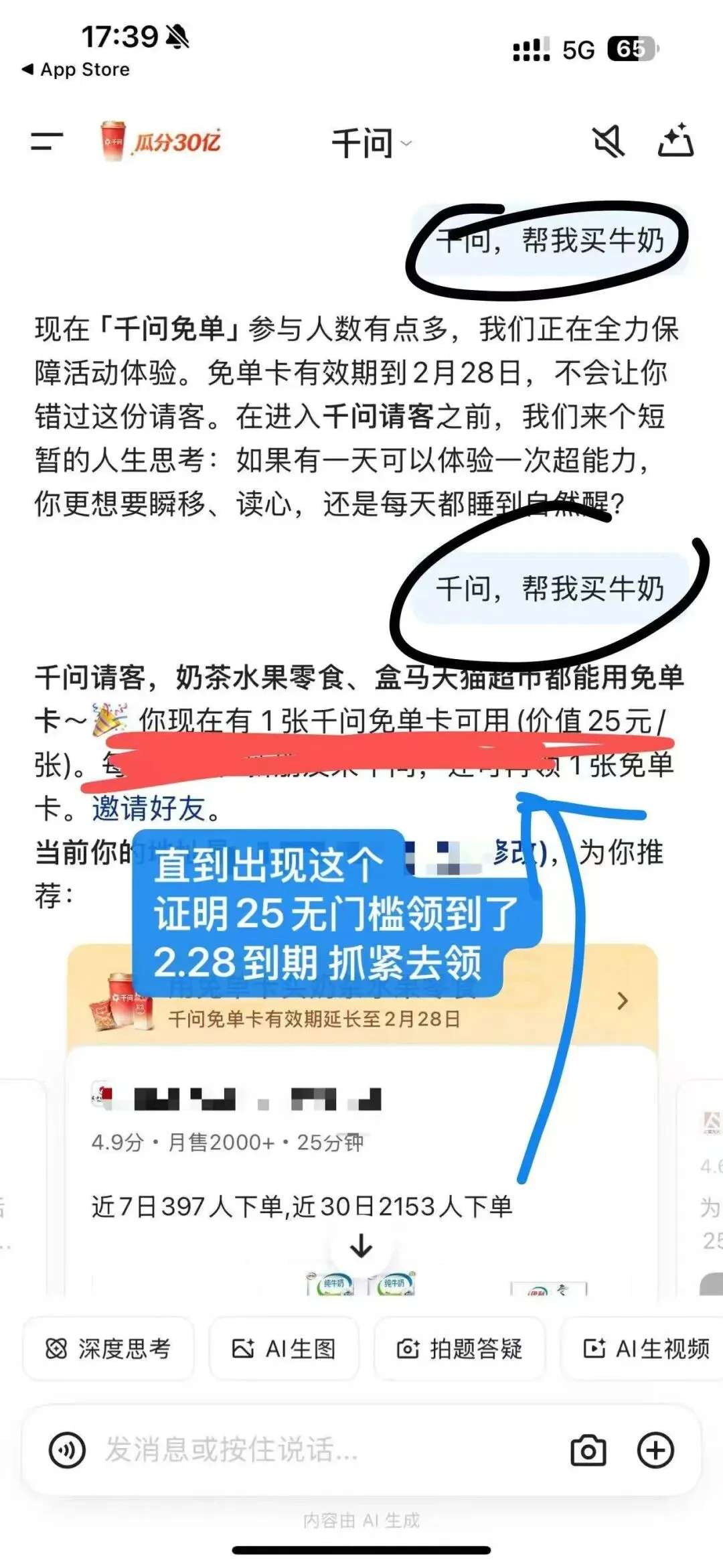 千问请客,奶茶水果零食、盒马天猫超市都能用免单卡~🎉 你现在有 21 张千问免单卡可用(价值25元/张)。每邀请 1 位新朋友来千问,还可再领 1 张免单卡。邀请好友。当前你的地址是:xxxxxx(点击修改),帮我点xxx