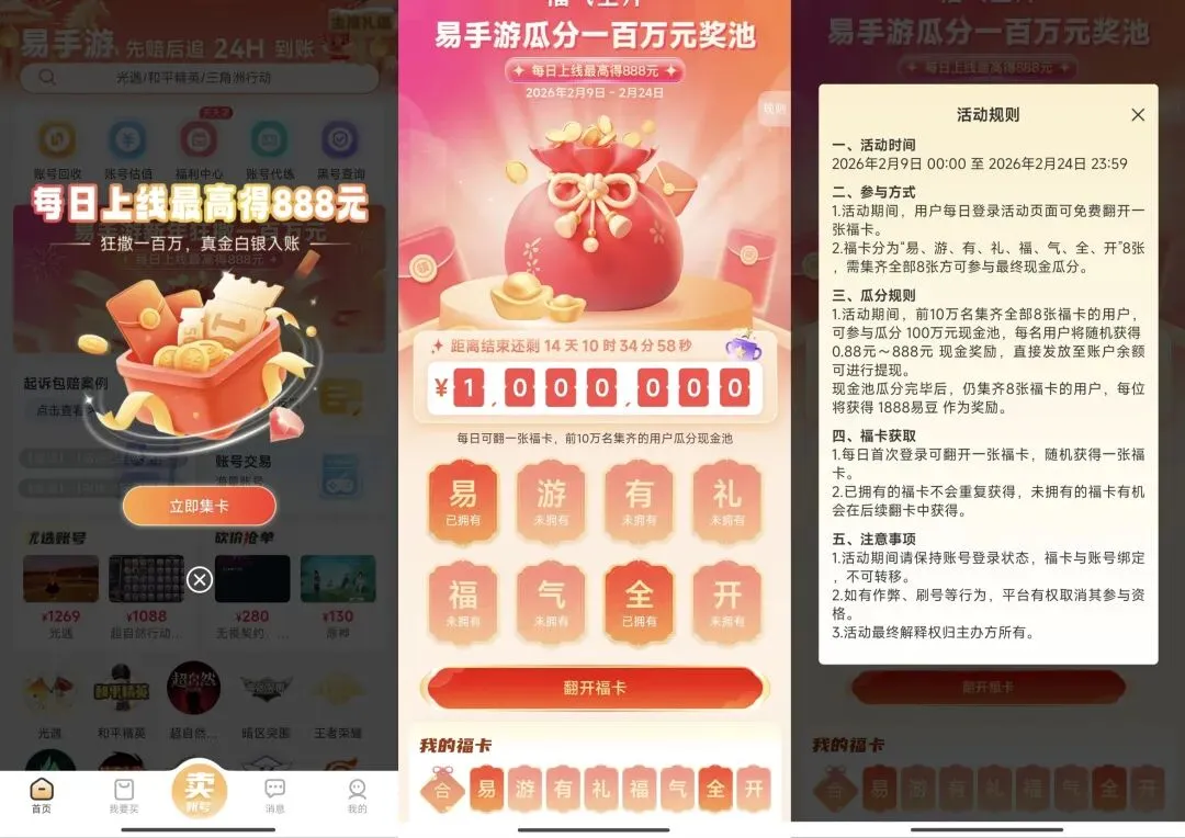 ③易手游手机应用商店自行下载注册,主页会弹出签到集卡,一共8天瓜分100w大奖,规则是一天签到获得一张福卡,且不会重复获得。(如果找不到界面在首页的滚动框自行寻找)