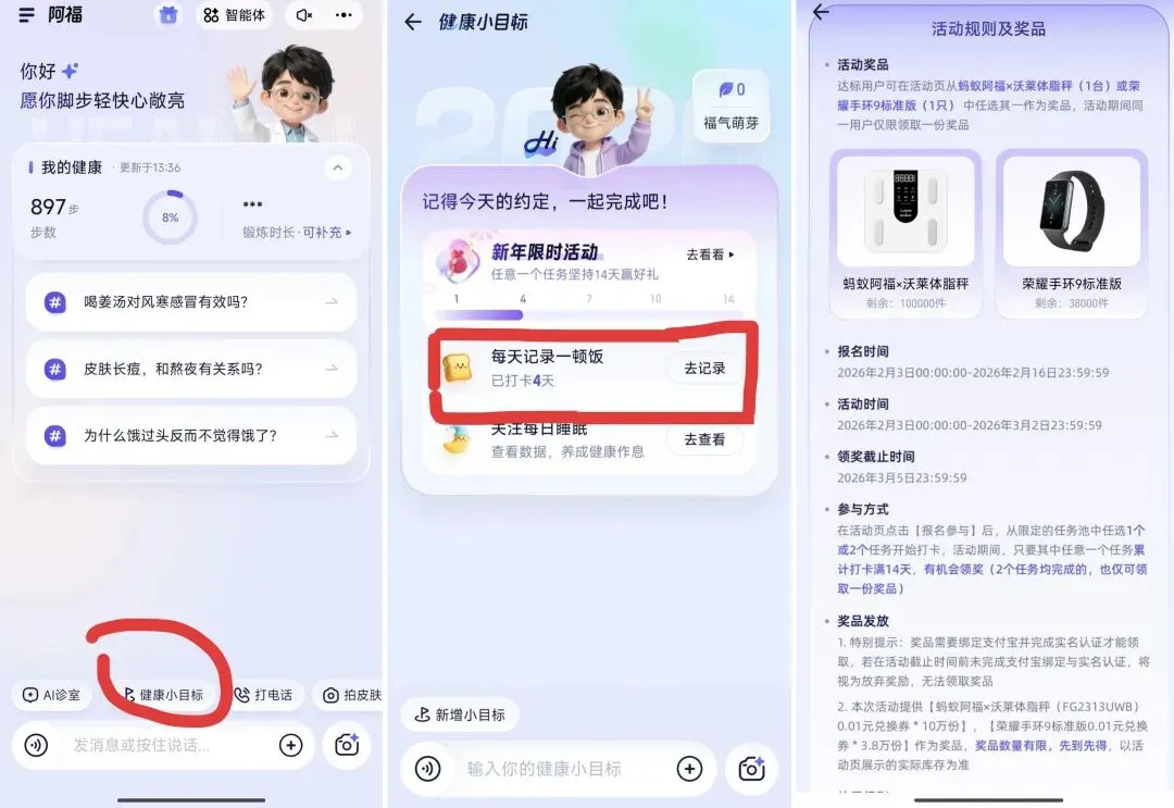 ⑤蚂蚁阿福自行手机应用商店下载,下载打开软件找到下方的健康小目标,每日记录一顿饭进行打卡,打卡15天体脂秤手环二选一