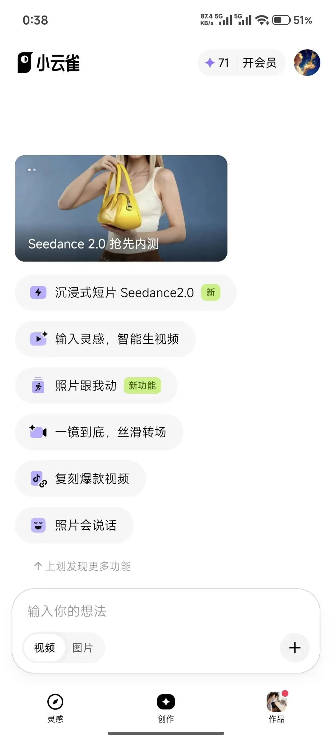 往下翻一翻,能看到几个功能板块,带“新”字标的“Seedance 2.0”一眼就抓住了我的注意力,还有“智能生视频”“照片会说话”这些,光看名字就知道是干嘛的。底部导航也特别简单,就三个按钮:灵感、创作、作品,不用在一堆图标里找功能,对我这种怕麻烦的人太友好了,不像有些APP,一打开各种按钮堆在一起,看得人眼花缭乱。