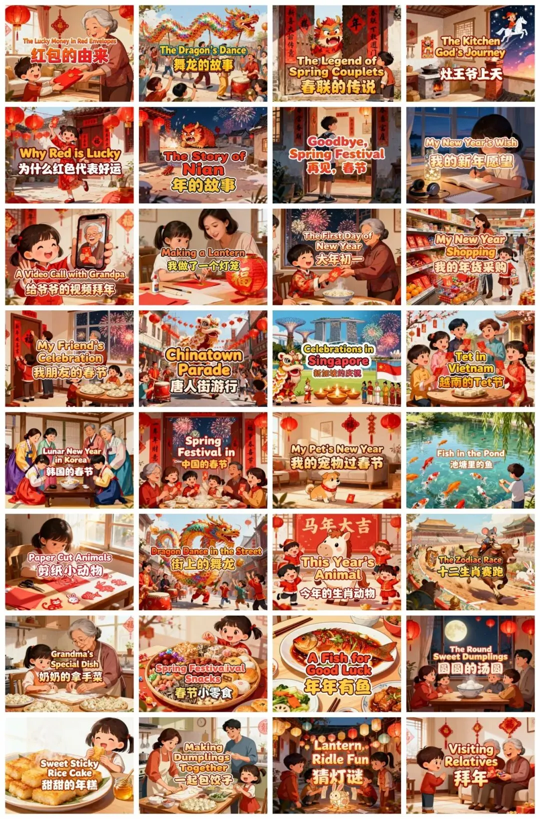 这是一套为小学生设计的春节系列英语短文,共六个专题,36篇。