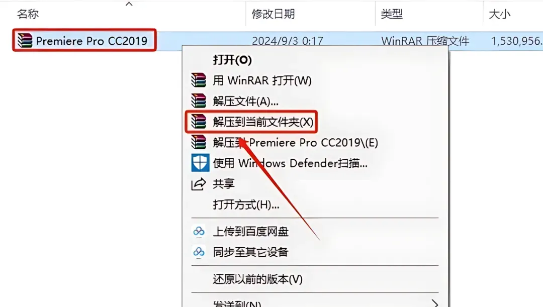 1.打开下载好的Pr软件安装包,鼠标右击压缩包选择【解压到当前文件夹】。