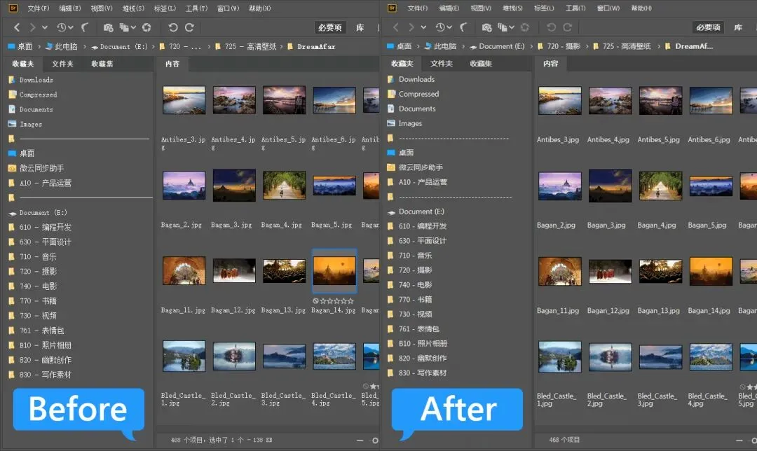 而 Bridge 自带高速缓存功能, 即使再多的文件,只需要打开一次,Bridge 就会自动缓存,下次就能快速打开了。