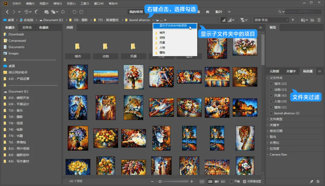 此外,Bridge 还有很多人性化的选项,让它在文件管理上的体验更上一个台阶,比如: