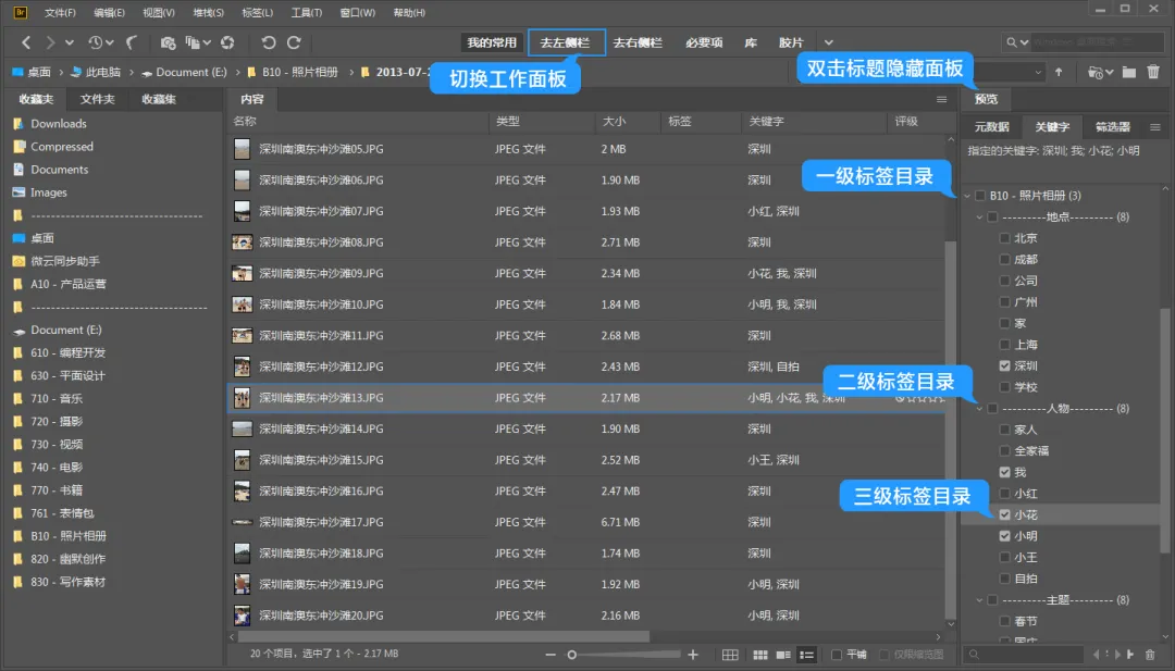 可以将文件拖动到任意你想要的位置,然后再进行诸如重命名、标记、关键字等操作,在处理复杂文件时很有帮助。