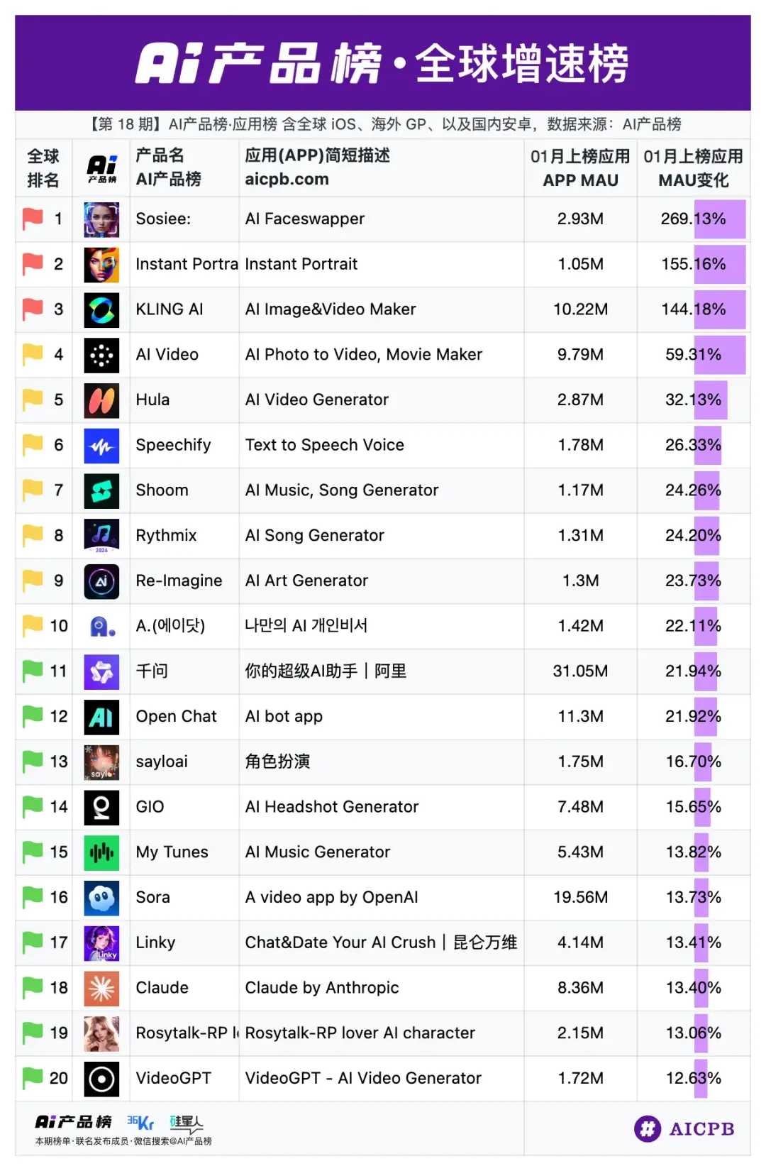 AI产品榜·应用榜·全球增速榜TOP10(2026年01月)