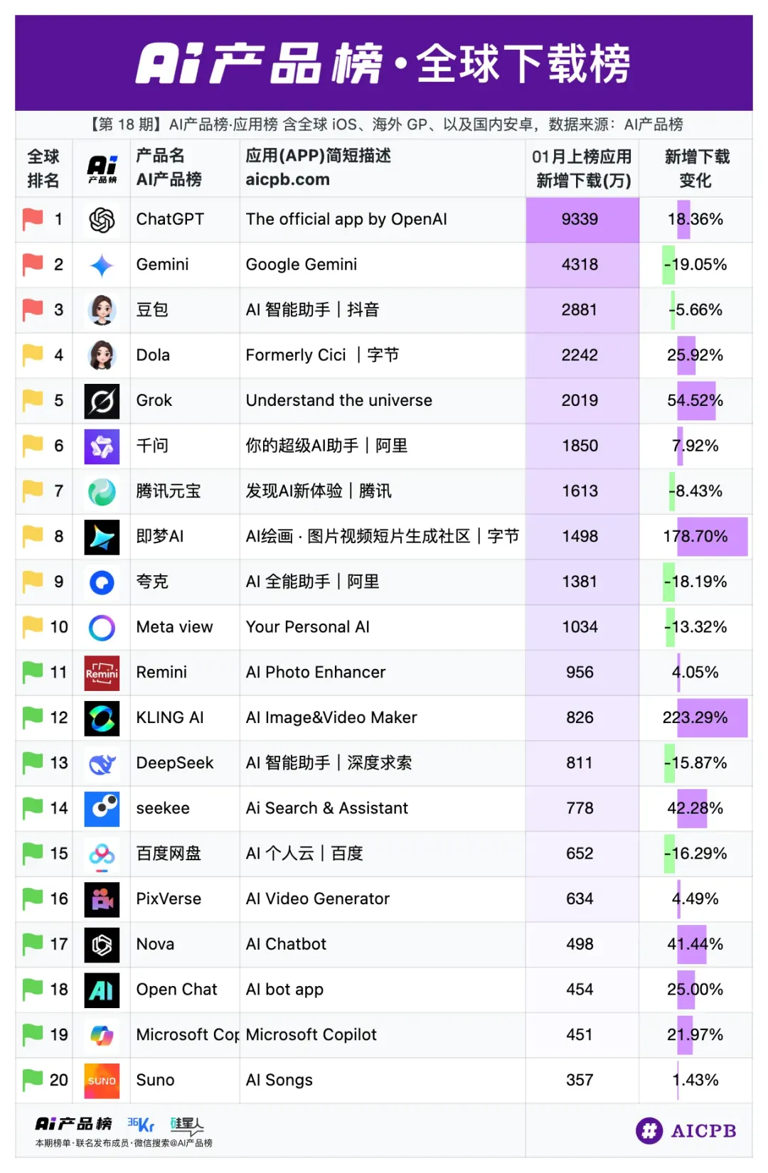 霸榜!2026年1月全球AI应用榜出炉:ChatGPT 9.3亿月活王者,KLIN6G AI狂涨144%,千问继续国内增速第一,春节撒钱大战开始|AI产品榜