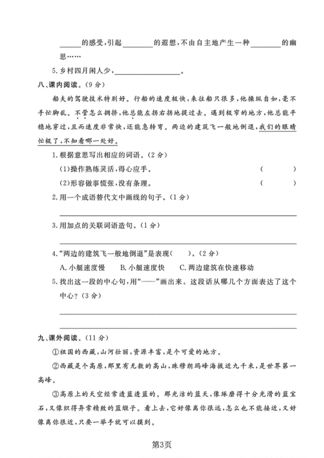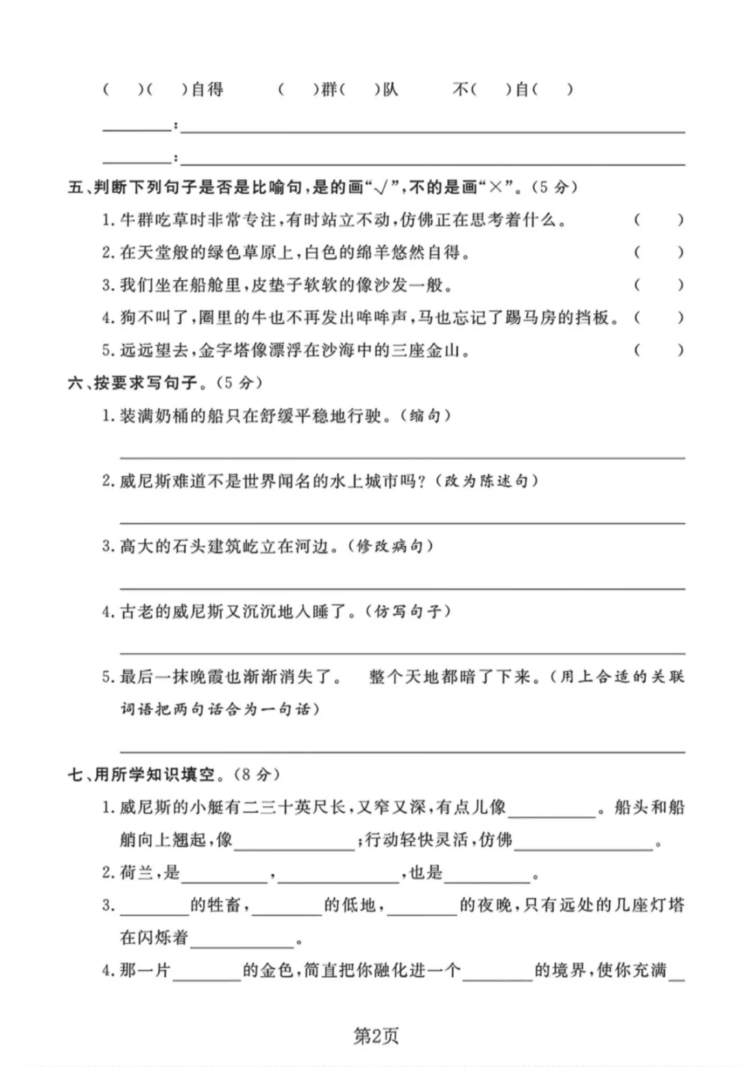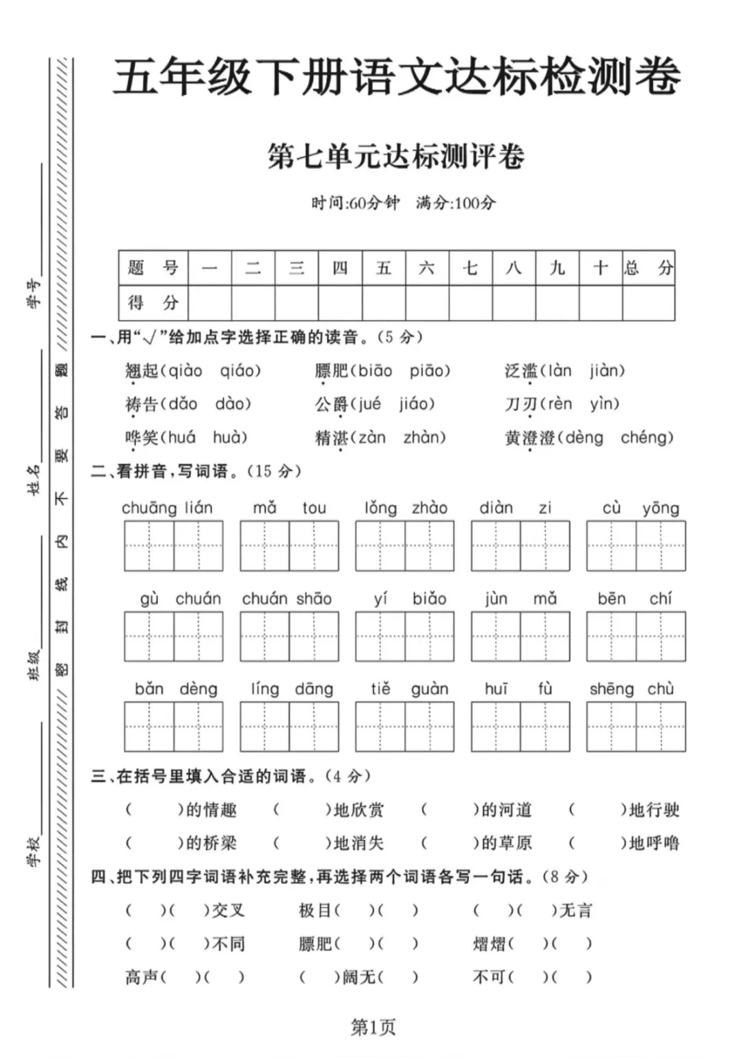 【免费下载】五年级(下)语文 第七单元达标检测卷