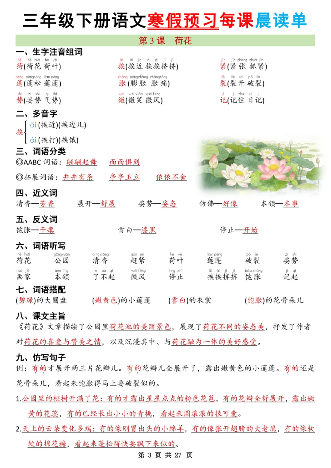 三年级(下)语文 26春新版寒假预习每课晨读单共27页
