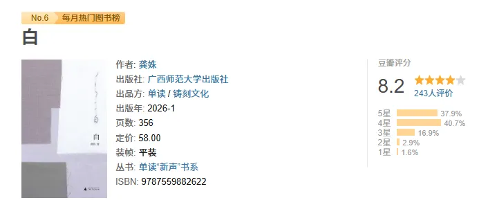 诺贝尔文学奖得主韩江的实验性力作《白》,以 “白” 为核心意象,用 65 篇碎片化短文,编织出一部关于记忆、生死与救赎的诗意文本。这部两度入围国际曼布克文学奖的作品,打破传统叙事框架,将个人伤痛与历史伤痕融为一体。