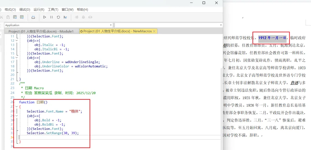 继续录制日期的宏如下所示,对照代码可以看到代码的生成过程。