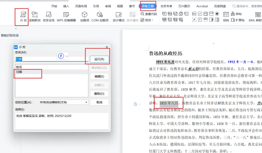 选择要使用宏的文字,然后选择宏脚本,进行运行宏