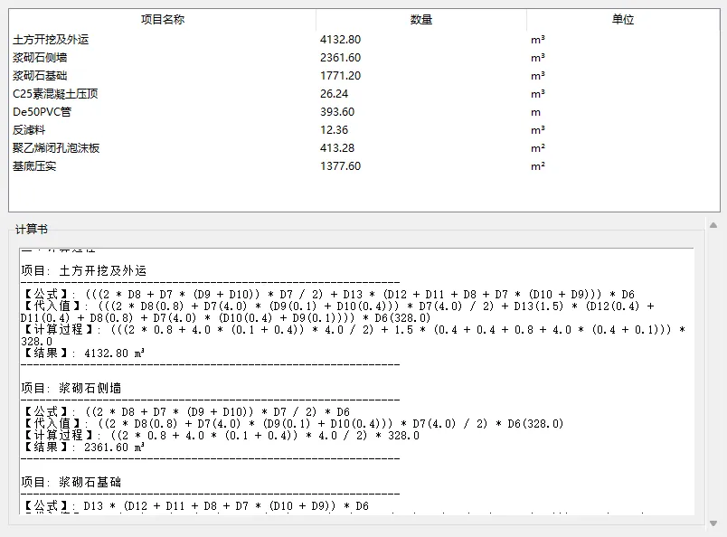 计算结果区:以表格形式汇总显示最终的计算项目、数量及单位。