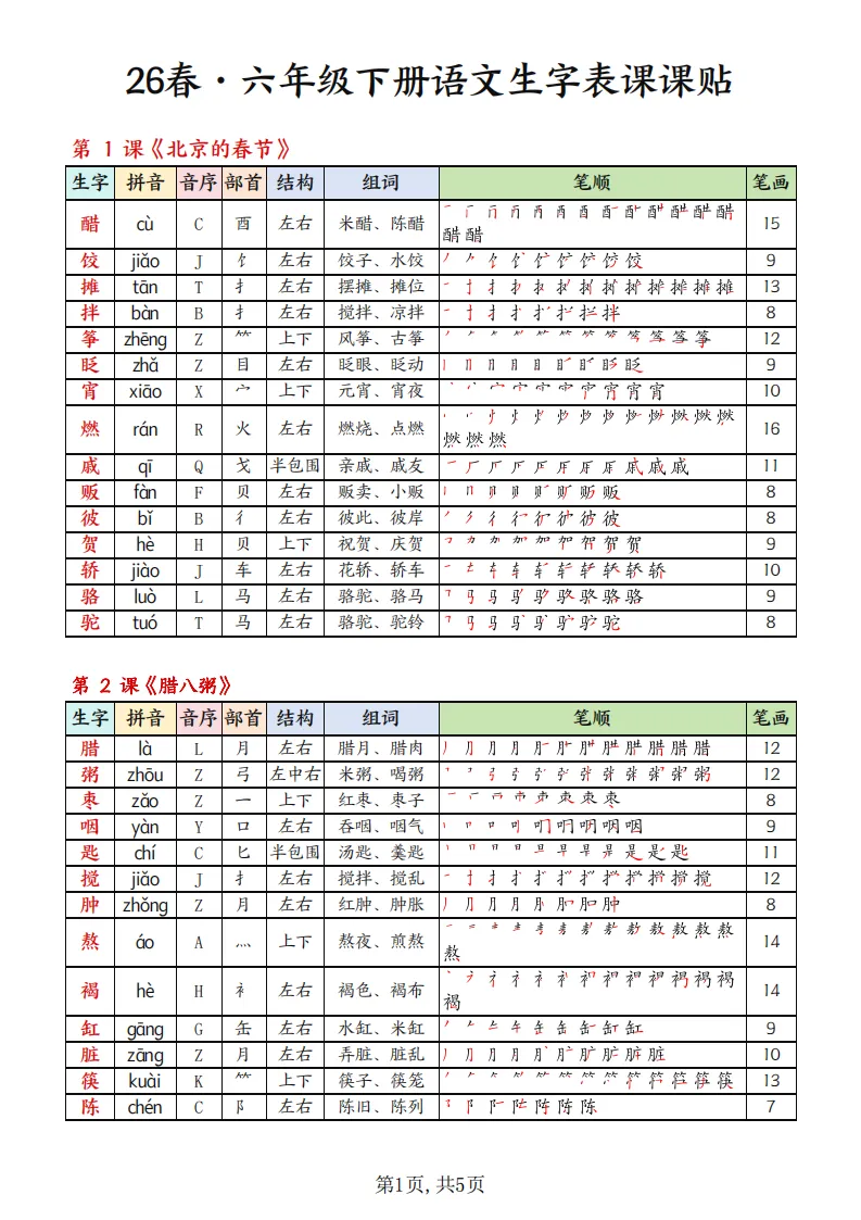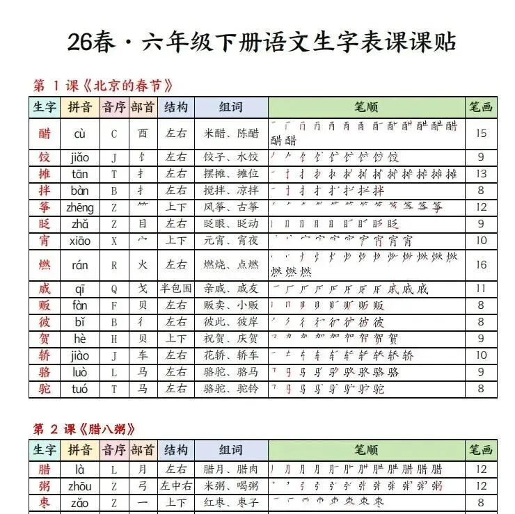 大家好,今天为大家分享的是一份非常实用的学习资料:26春六年级语文下册《生字组词课课贴》。这份资料专为六年级下学期的语文学习设计,能够帮助孩子高效掌握每课的生字和词语,是预习和复习的绝佳帮手。