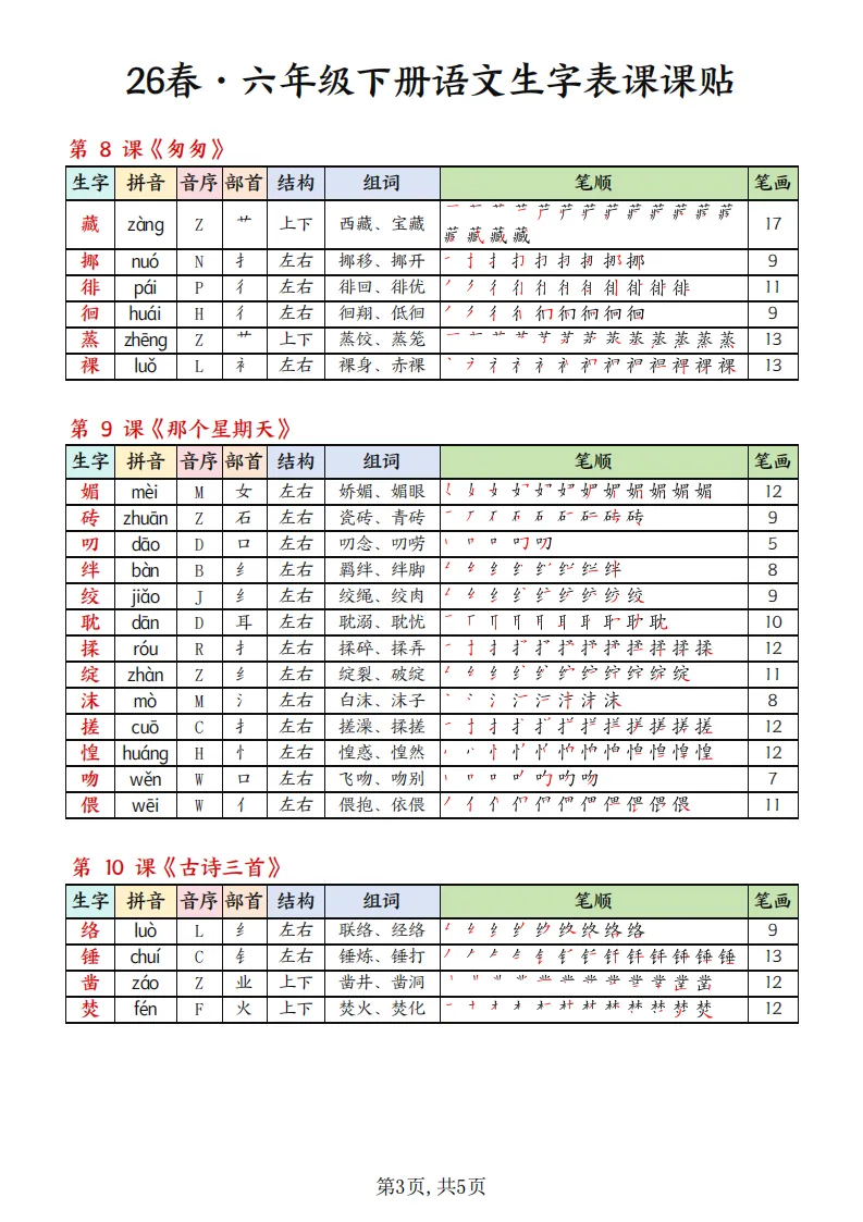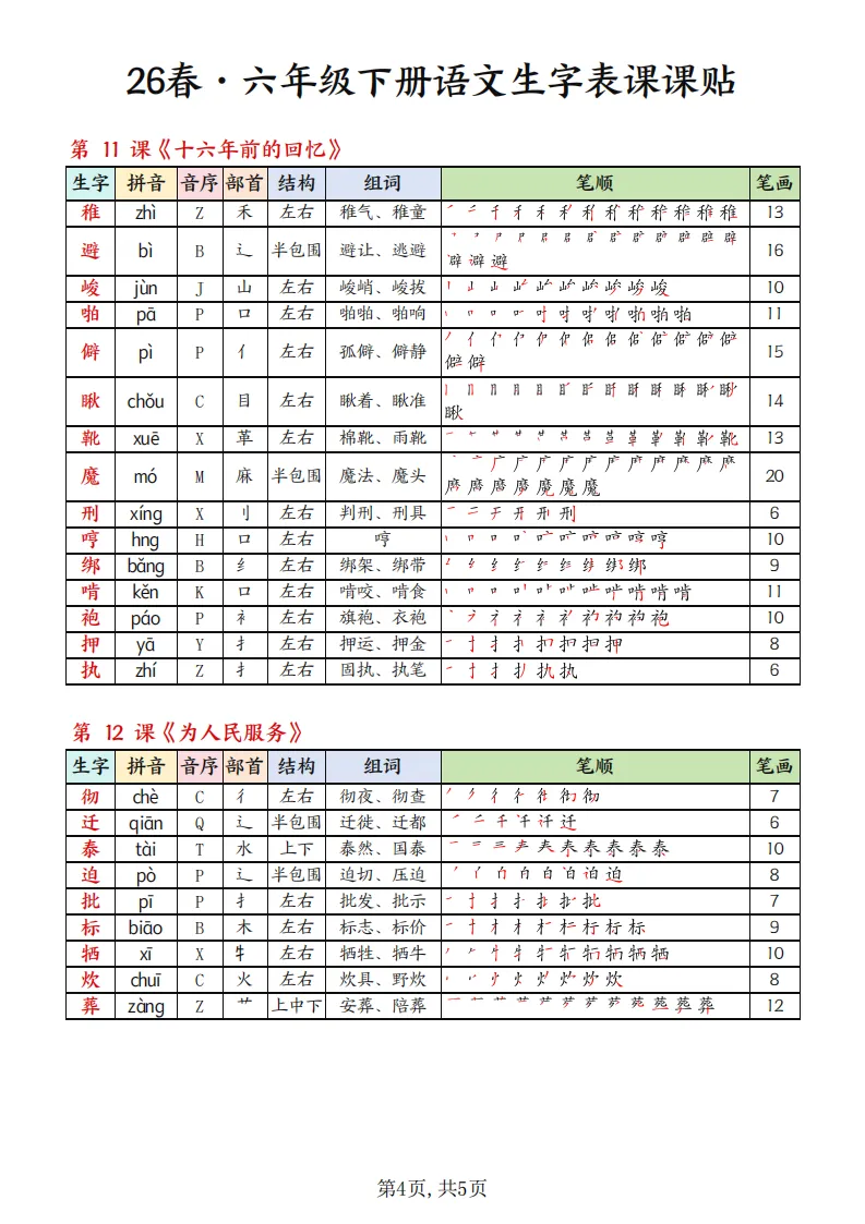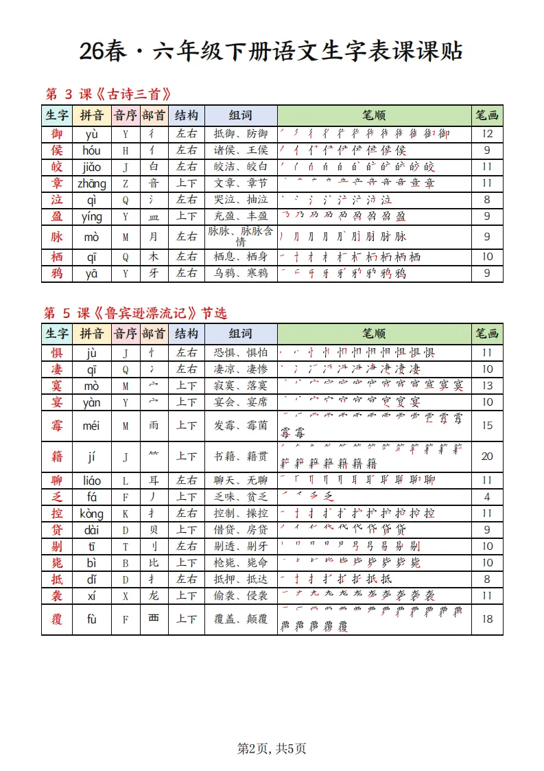【免费下载】26春六年级语文下册生字组词课课贴,完整版 | PDF高清电子版可打印