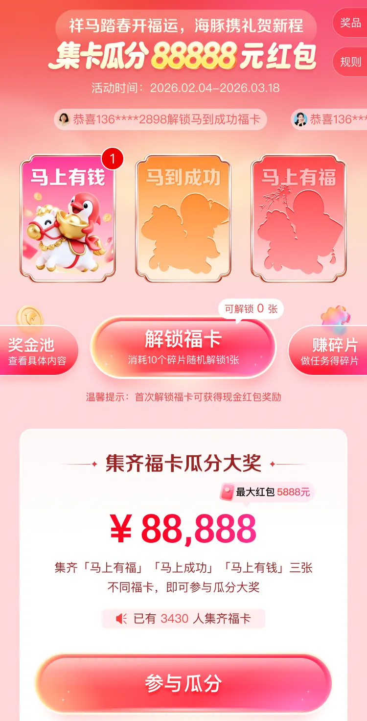 海豚 APP 投教集卡活动上线,88888 元新春红包等你来瓜分