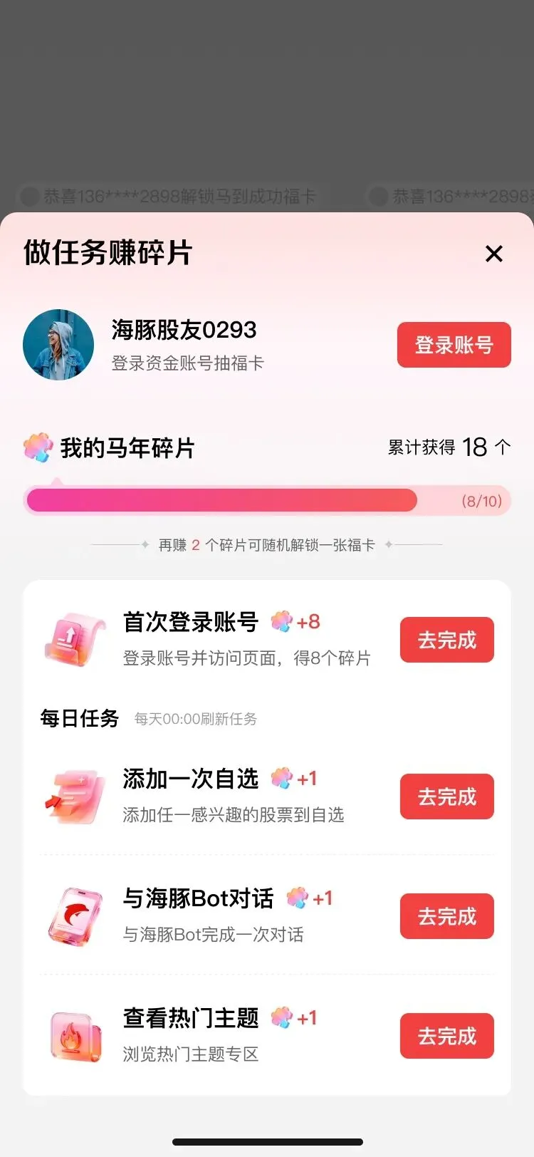 打开海豚APP,进入活动页面,首次登录账号直接解锁 8 个马年碎片,每日还有 3 个简单任务,完成即领碎片!