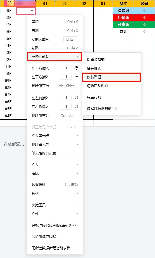 将【业主看房分布】中的数据,通过选择性粘贴-仅粘贴值的方式,粘贴至【业主看房状态】对应的单元格中。