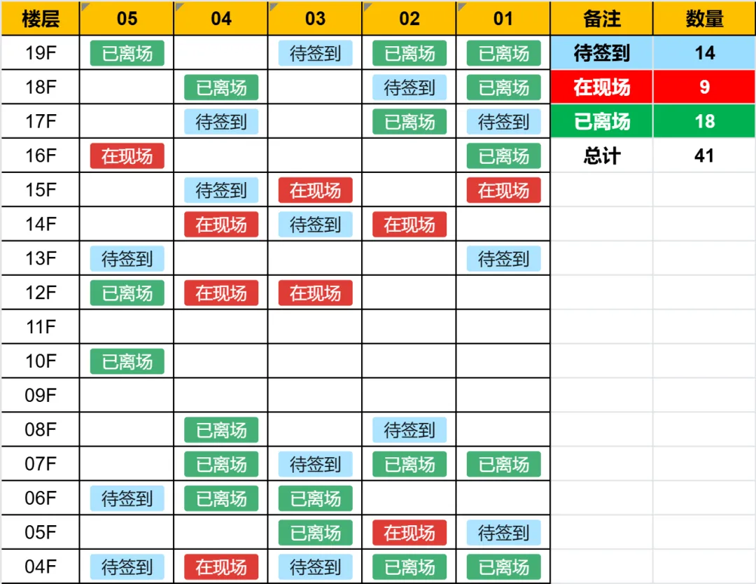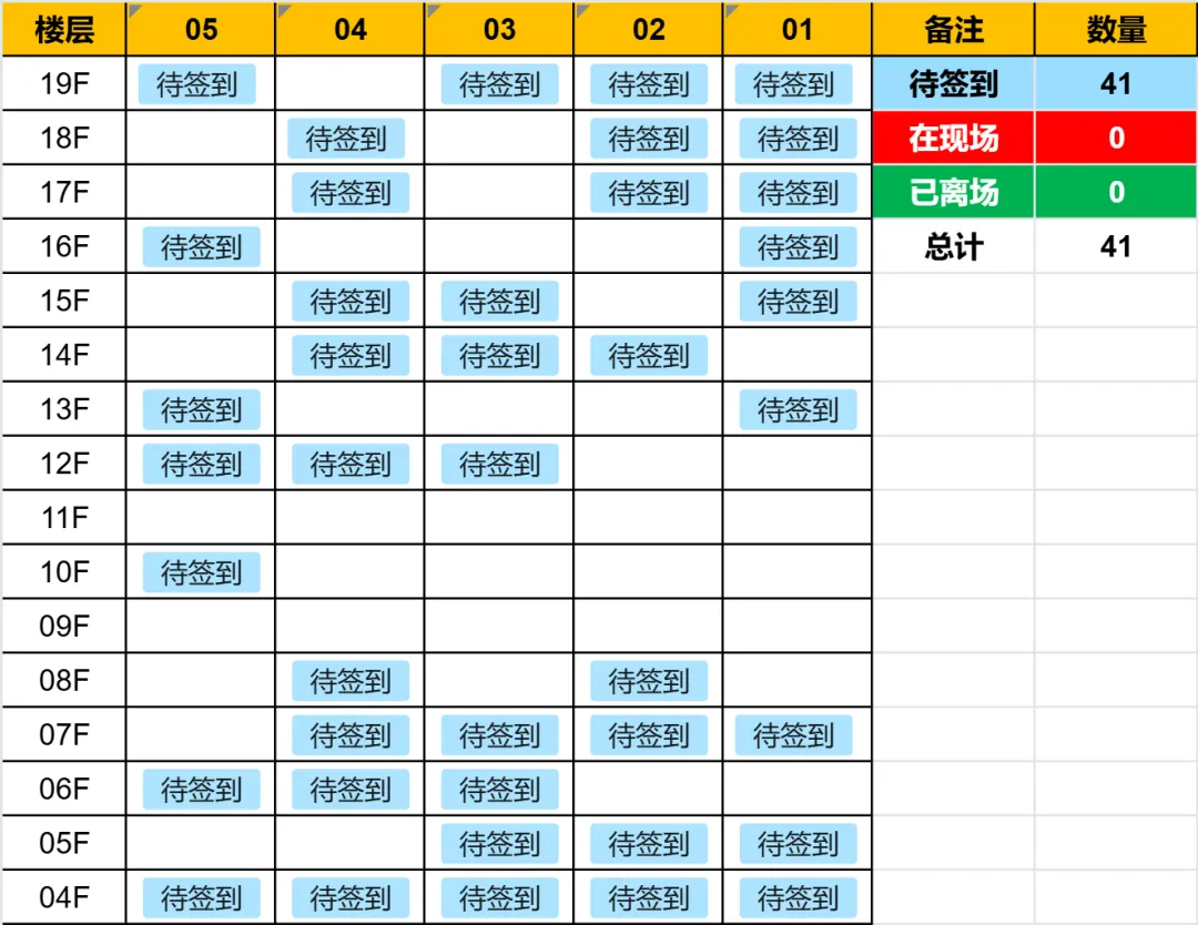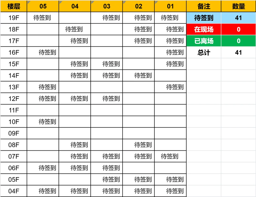 设置好后,二维矩阵中每一户将变为【下拉列表】,原先显示的“待签到”信息也会变为相应的色块。