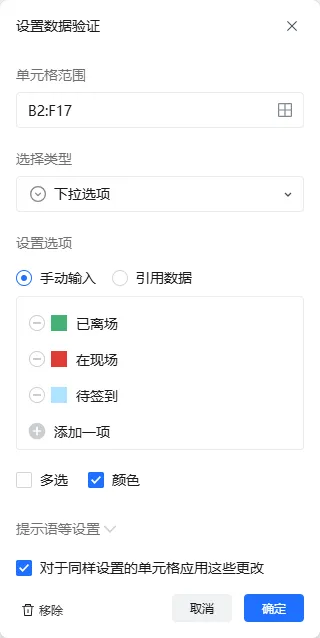 可以为不同状态设置不同的名称和颜色。例如设置【待签到】、【在现场】、【已离场】,并分别为它们设置浅蓝色、红色和绿色。