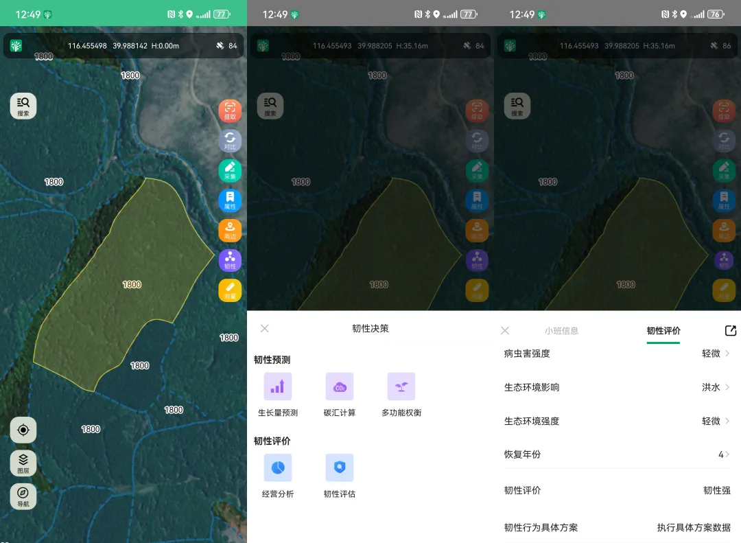 决策支持层面,应用搭建了韧性决策功能框架,涵盖生长量预测、碳汇计算、多功能权衡、经营分析、韧性评价五大核心模块。基于选中小班基础数据,通过专业模型计算平均胸径、林分平均高、碳汇量等指标,分析碳汇、涵养水源等功能的权衡关系,生成可持续经营策略与生态韧性评价报告,其结果可以微信共享的实现方式,为林业规划、生态保护、经营决策提供初步科学数据参考。