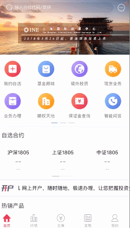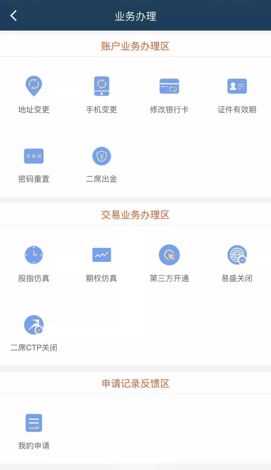 点击首页图标“业务办理”进入掌上营业厅,即可看到账户业务办理、交易业务办理及申请记录反馈三大业务区。选择您需要办理的业务即可。