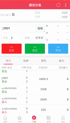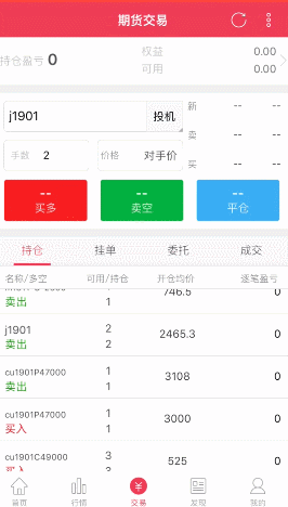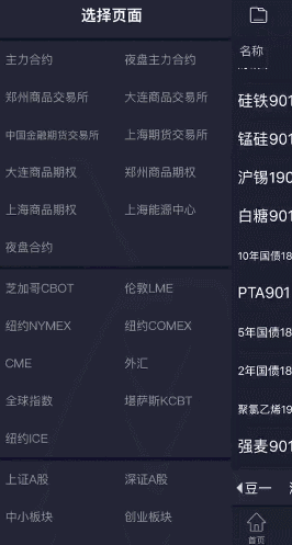 可由底部导航栏进入行情页面,首次使用APP进入行情后,会优先展示主力合约,当添加自选合约后,再次进入行情模块时会默认进入自选合约。