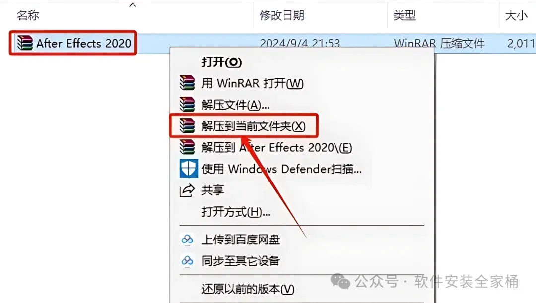 1.打开下载的AE软件安装包,然后鼠标右击压缩包,选择【解压到当前文件夹】。