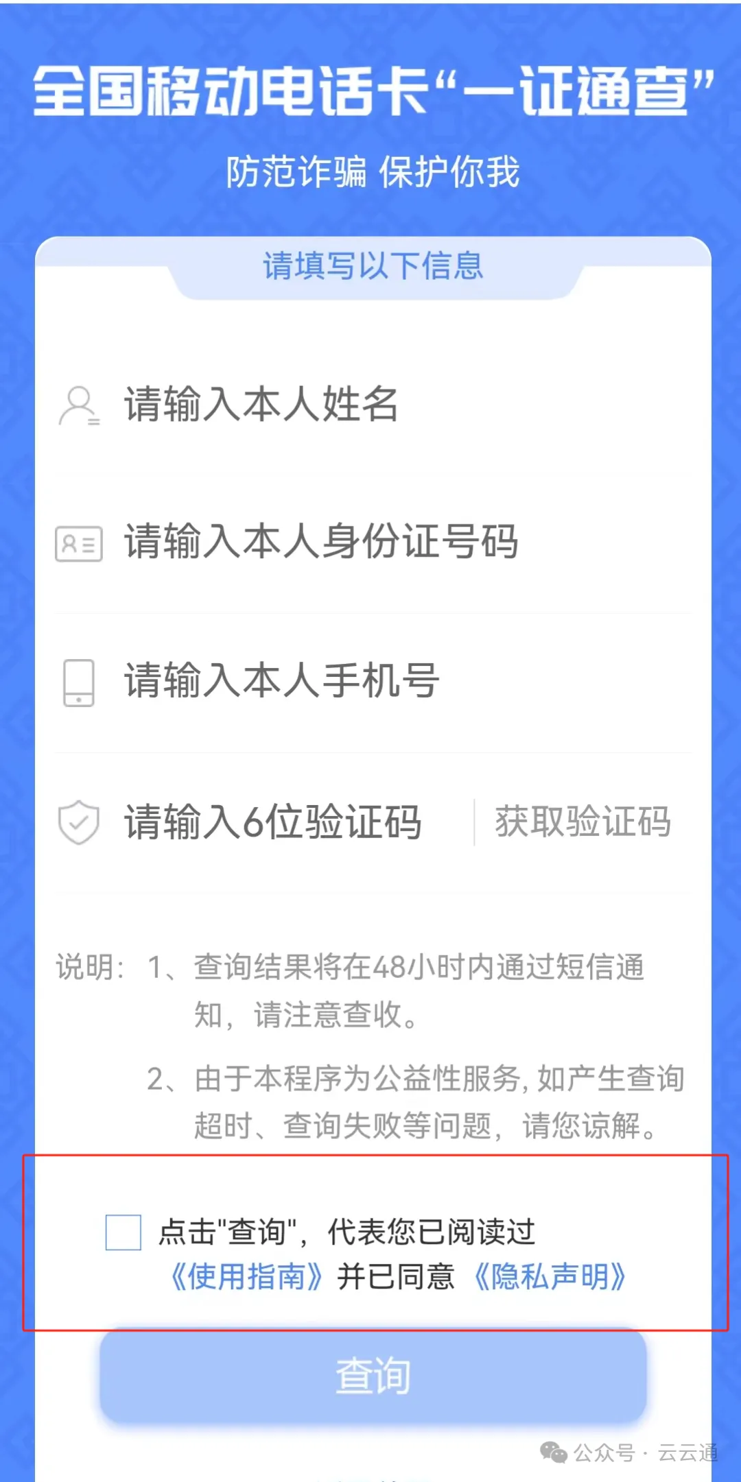 提交后查询结果会在48小时内通过短信通知。(同一用户24小时内只能查询一次)