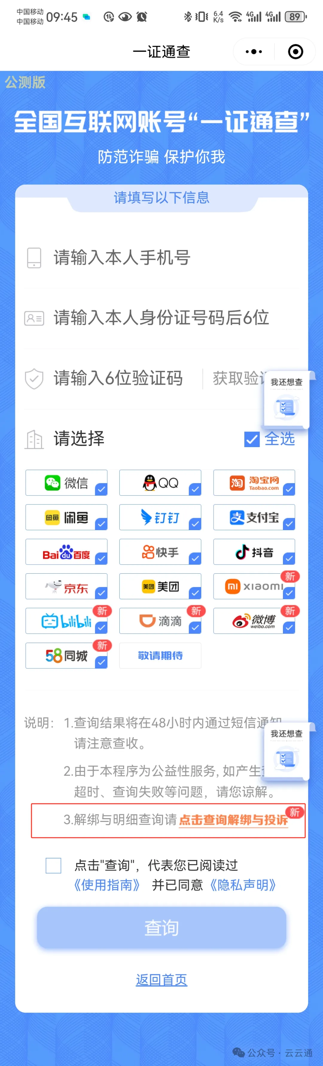 点击【一证通查】互联网账号端口,输入手机号、身份证后6位及验证码,就可以查询多款热门应用注册情况。