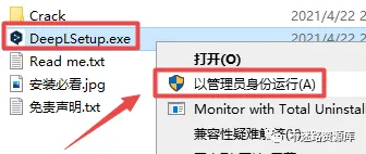 2.打开刚刚解压的文件夹,找到并选中“DeepLSetup”,鼠标右键点击“以管理员身份运行”