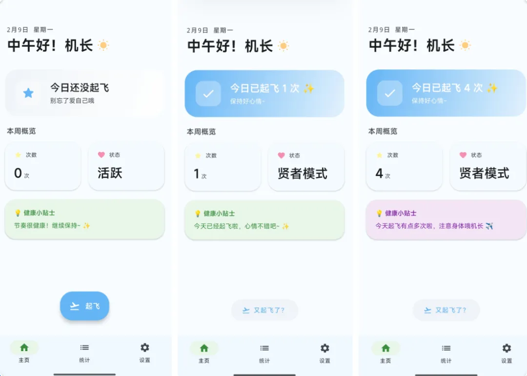 每次执行飞行训练,点一下就记录成功。状态会从“活跃”切换到“贤者模式”,顺带给你一条健康小贴士。