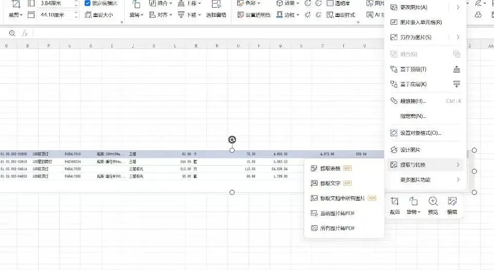 这时WPS软件的“图片提取表格”的功能就可以上线了,右击图片,找到自动提取表格数据(提取图片文字等)。