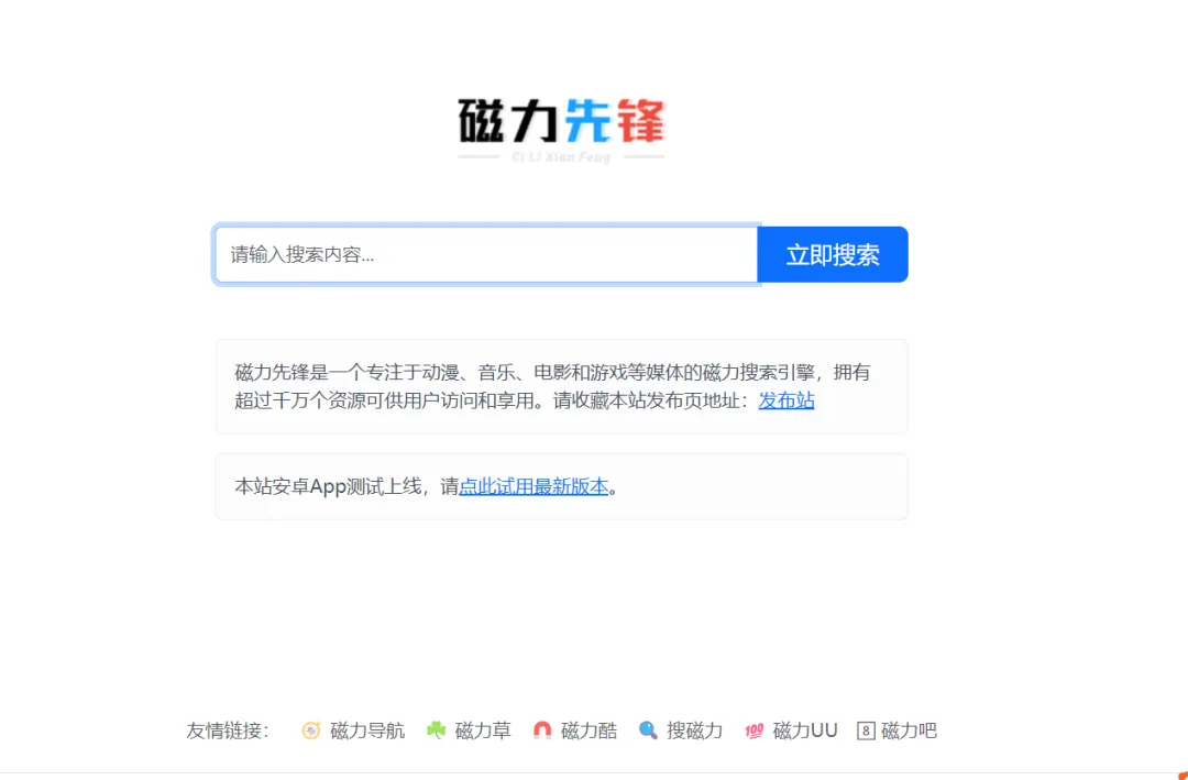 Magnetic Quick Search APP(安卓版)是一款免费、无广告且无限制的磁力搜索工具。它搜索源多、速度快,界面简洁,无任何广告或使用限制。打开软件,点击下方搜索按钮就能直接用,像电影名、演员名、粉丝名等关键字都能搜 。