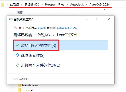 7.返回安装文件夹,双击打开“Crack”文件夹,复制“acad”文件