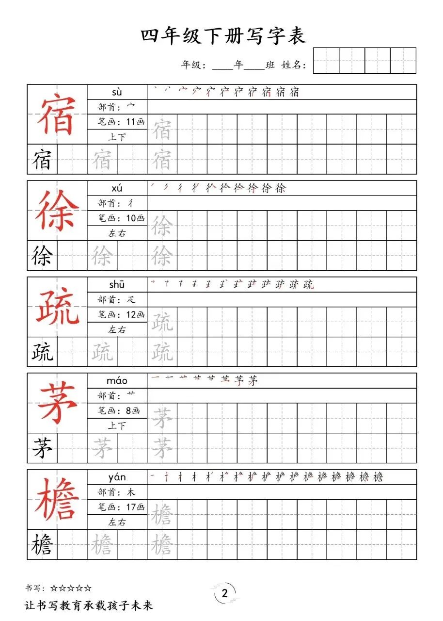 四年级(下)语文【写字表字帖】,pdf电子版,可下载可打印