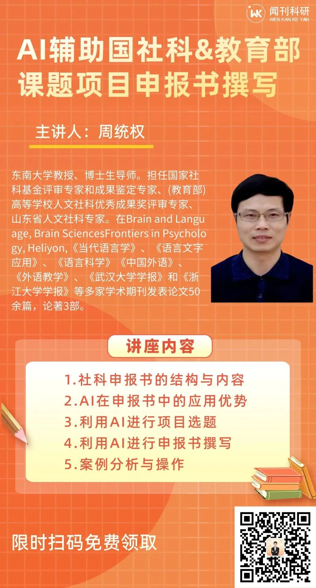 为此,闻刊科研邀请到东南大学教授、博士生导师——周统权老师,为大家带来《AI辅助国社科&教育部课题项目申报书撰写》将为大家讲解社科申报书的结构内容,并通过案例实操展示如何用AI进行项目选题和申报书的撰写,帮助大家提升申报书写作效率,提高科研和项目申报水平。