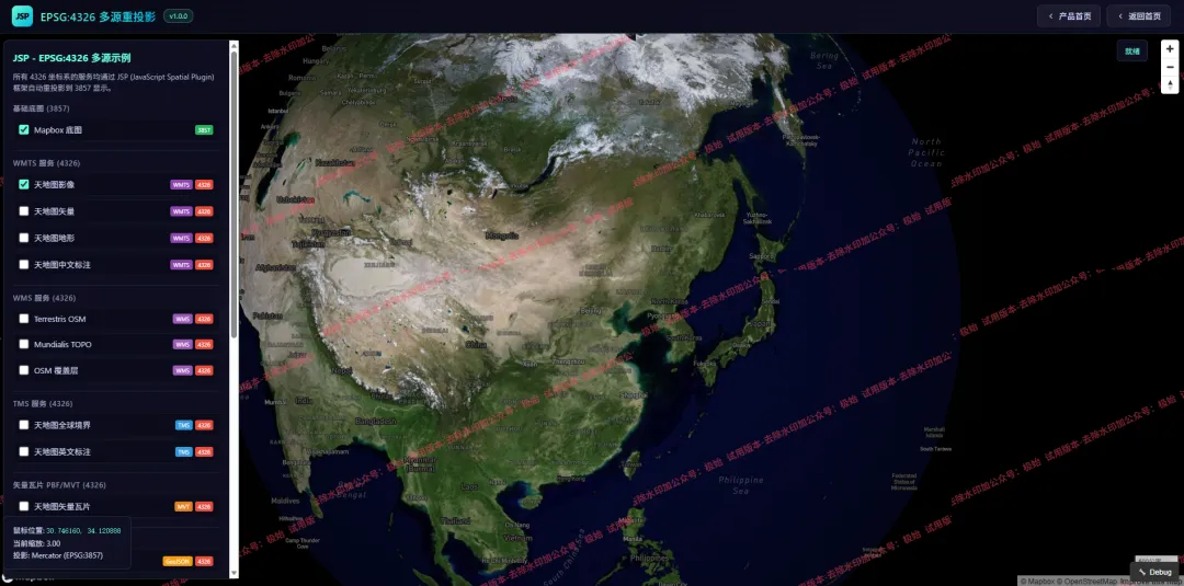 – 支持4326/4490坐标系底图叠加,支持同时叠加4326和3857底图